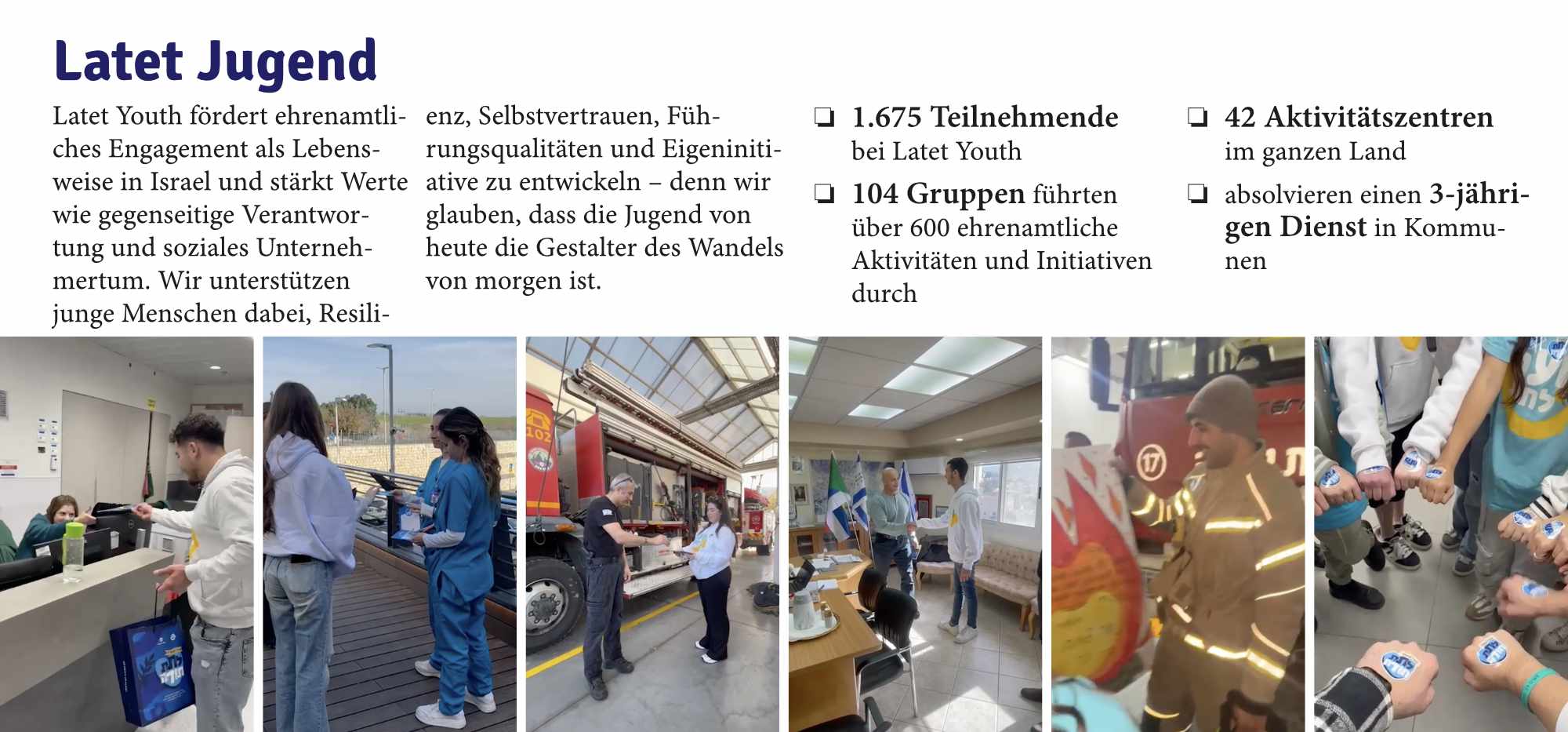 Lates Fähigkeit, landesweit zu helfen, ist das Ergebnis einer bemerkenswerten gemeinsamen Anstrengung. Sie ist den Hunderttausenden Israelis zu verdanken, die sich in diesem Jahr für eine Spende entschieden haben. Sie ist den Tausenden Spendern in den Vereinigten Staaten, Frankreich, der Schweiz, Belgien, Deutschland und weltweit zu verdanken, die ihre Solidarität mit Israel durch die Unterstützung unserer Arbeit zum Ausdruck gebracht haben. Sie ist den Tausenden Freiwilligen zu verdanken, die mehr als eine halbe Million Stunden ihrer Zeit für die Bedürftigsten aufgewendet haben. Und sie ist den 1.800 Mitgliedern unserer Jugendbewegung und drei nationalen Freiwilligendienstgruppen zu verdanken, die vor Ort Seite an Seite gearbeitet haben, um nach zwei Jahren Krieg das soziale Gefüge Israels wiederaufzubauen.