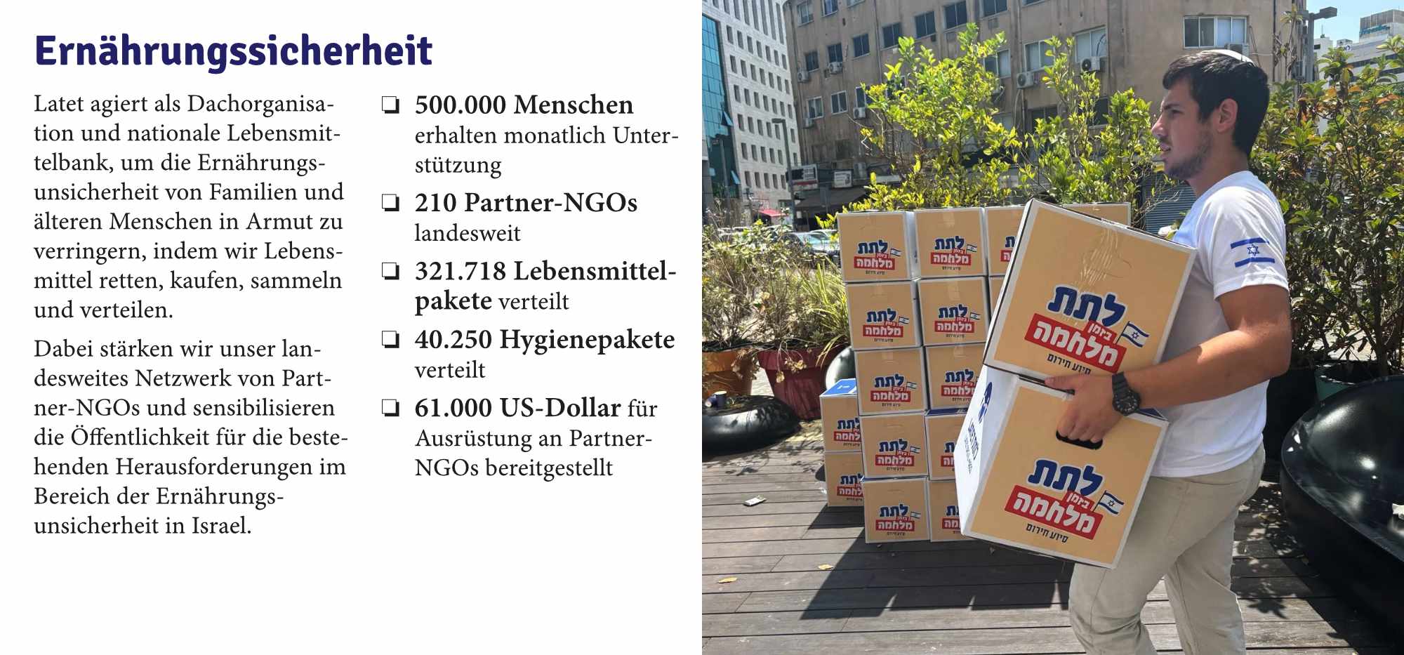 Im vergangenen Jahr blieben wir unseren Werten und unserem Engagement für die am stärksten gefährdeten Bevölkerungsgruppen Israels treu. Wir arbeiteten unermüdlich daran, Hilfe dorthin zu bringen, wo sie am dringendsten benötigt wurde. In über 130 Orten und in allen Bevölkerungsgruppen, ohne Unterschied, handelte Latet nach einem klaren Prinzip: dem Schutz der Menschenwürde.